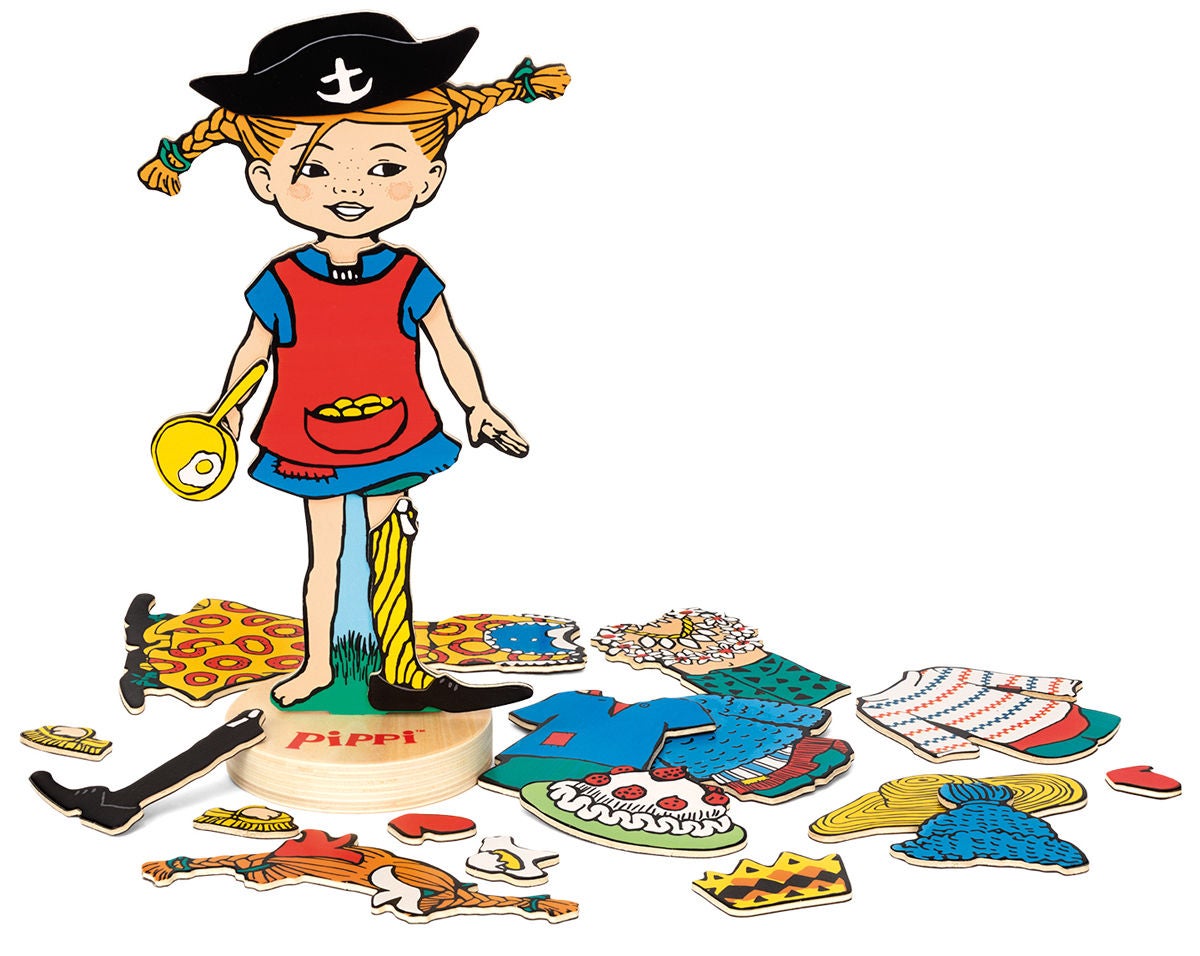 Pippidukke i træ med 20 magneter, der består af sjovt tilbehør og forskelligt tøj. Bestem hvad hun skal have på bliver det en kage som hat eller en æg i håret? Når Pippi er med, bliver det alltid skørt! Anbefalet alder: Fra 3 år. FSC-mærket træ