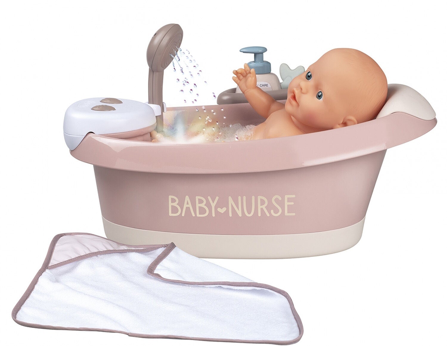 Dukkespabad fra Smoby med et sjovt design. Det har et boblebad med vandstråler og bobler og LED-lys i forskellige farver. Dukkespabadet har et blødt badehåndklæde i frotté, en showergel og et hvalformet badetermometer som skifter farve og bliver lyserød ved kontakt med vand. Perfekt til timevis af fantasifuld leg. Passer til dukker op til 42 cm (OBS! Dukke medfølger ikke). CE-mærket. Anbefalet alder: Fra 3 år. Batteri: 3x AAA (medfølger ikke).