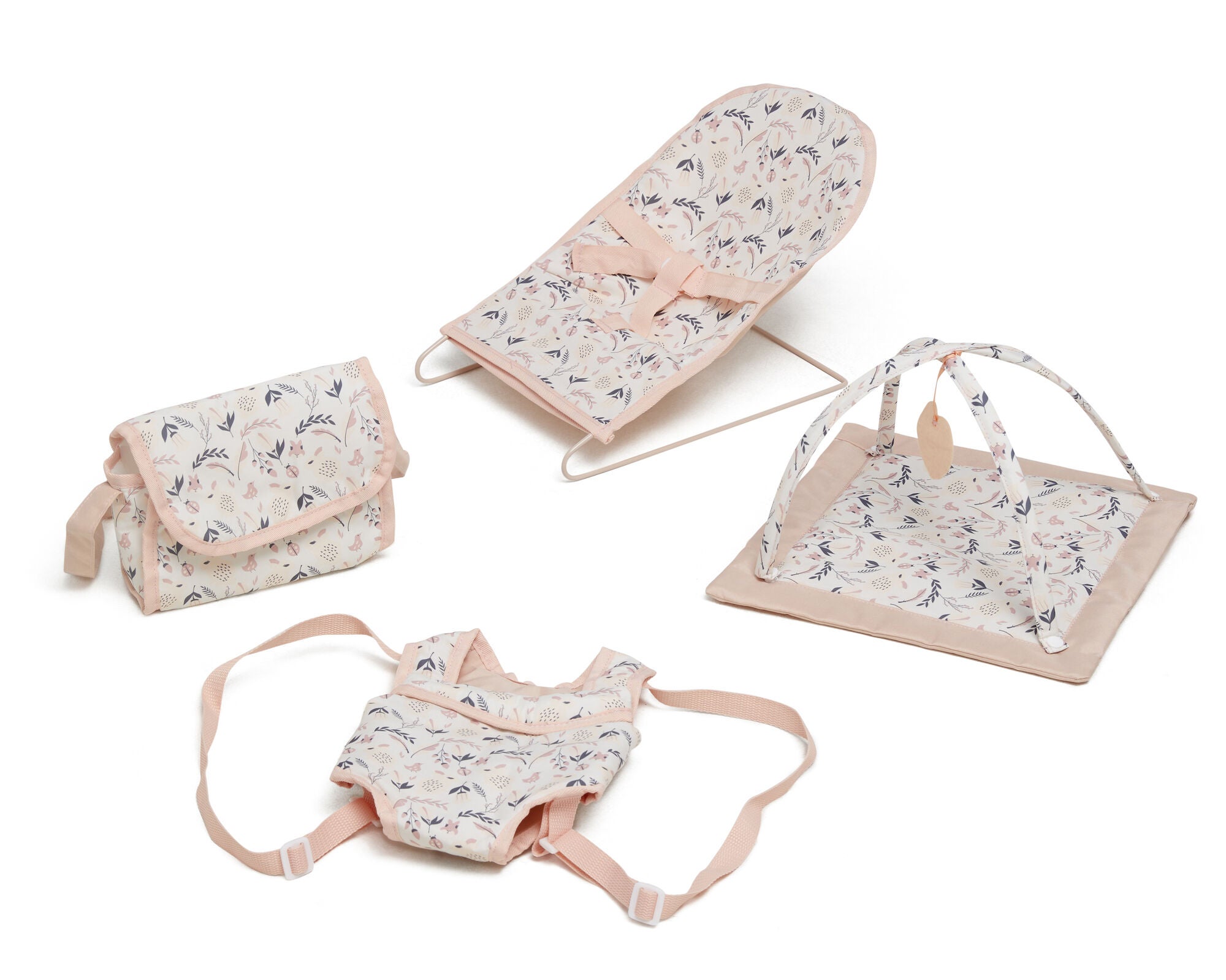 Dukketilbehør fra Cloudberry Castle med kaninmotiv. Det har en skråstol og en bæresele. Dukketilbehøret har et aktivitetscenter og en pusletaske, som hjælper til med at holde både bleer og cremer på plads og synlige. Perfekt til rolleleg med venner eller familie. Indeholder: 1 skråstol, 1 bæresele, 1 legetæppe, 1 pusletaske. Skråstolsmål (cm): L: 34, B: 22, H: 20. Bæreselemål (cm): L: 21, B: 1,5, H: 28. Legetæppemål (cm): L: 29.5, W: 29.5, H: 16. Pusletaskemål (cm): L: 19,5, B: 9, H: 12. CE-mærket. Anbefalet alder: Fra 3 år.
