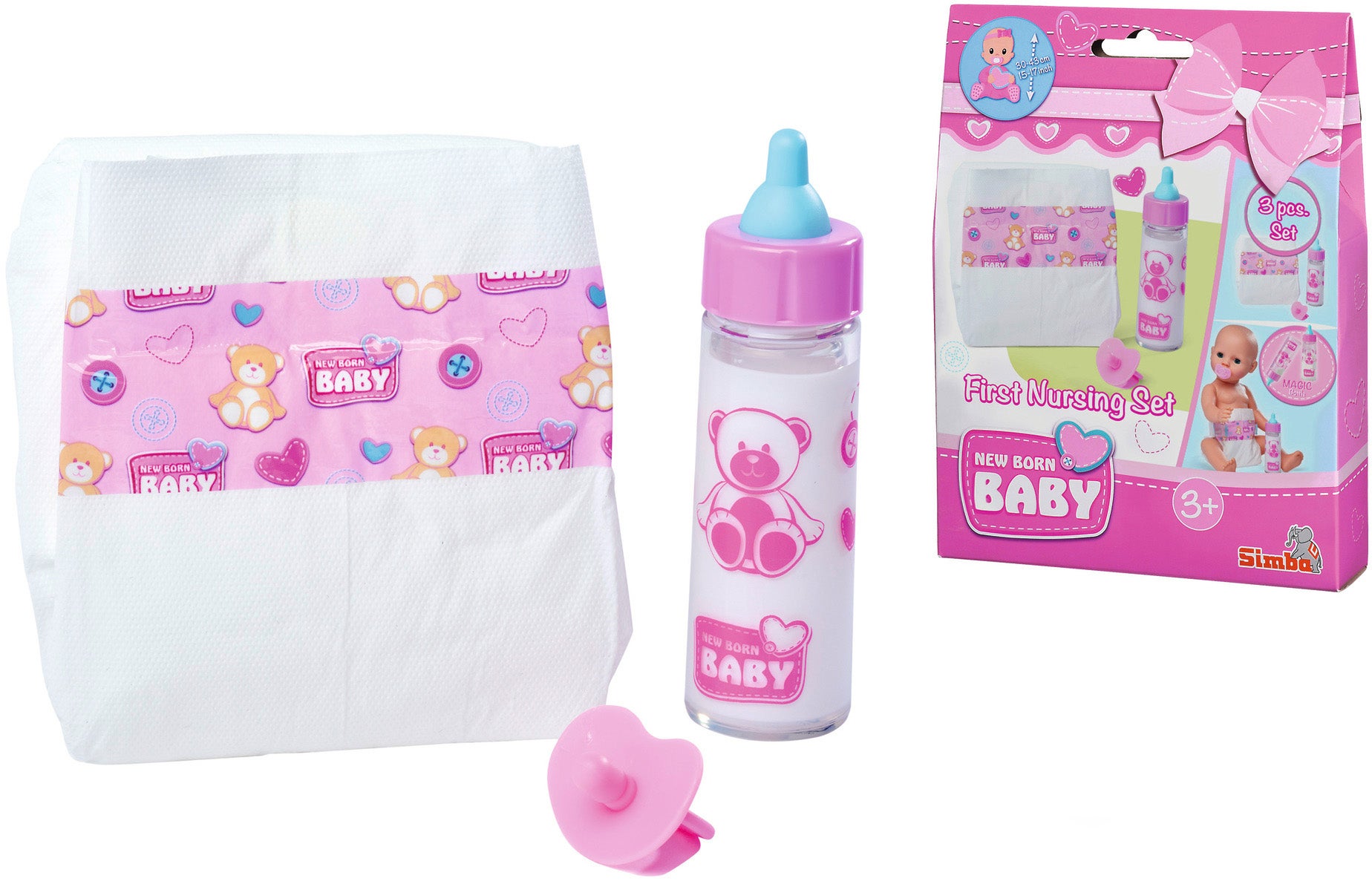 Dukketilbehørssæt fra New Born Baby til at pleje din dukke med. Perfekt til timevis af fantasifuld leg. - Indeholder: 1 ble, 1 sutteflaske, 1 sut. - Magisk flaske: når dukken drikker af sutteflasken, forsvinder indholdet. - Passer til dukker i størrelsen 38-43 cm. - Dukke medfølger ikke. - Udvikler fantasien. - CE-mærket. - Anbefalet alder: Fra 3 år. - Plastik.