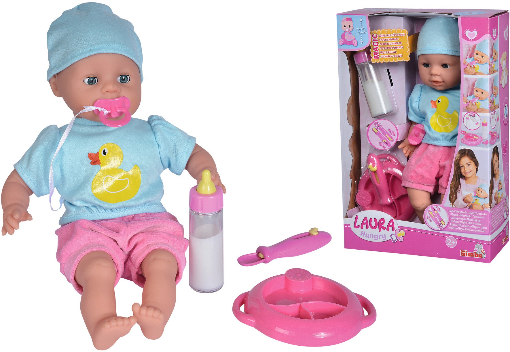 Dukke fra Simba Toys med et sødt outfit. Den har en magisk ske og sutteflaske, hvor indholdet forsvinder ved madning. Perfekt til timevis af fantasifuld leg. - Indeholder: 1 dukke, 1 sut, 1 sutteflaske, 1 ske, 1 tallerken. - Dukken måler 30 cm. - Blød krop. - Magisk ske og flaske, hvor indholdet forsvinder ved madning. - Produktet sælges assorteret. Du får en af dukkerne på billedet. - CE-mærket. - Anbefalet alder: Fra 3 år. - Plastik.