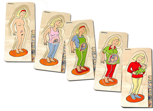 Det kan være svært nok for os voksne at forstå og når man så er barn, ja så kan det jo være endnu mere kompliceret.Med dette puslespil starter man med at se en mor med et barn på armen og under hvert lag ser man barnets udvikling baglæns i morens mave.God gave idé hvis dit barn skal være storesøskende. Med dette puslespil, kan dit barn danne sig et indtryk af, hvor langt man er i graviditeten.Også et helt generelt godt puslespil, til at forklare om hvordan man kommer til verden.