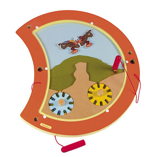 Med magnetpennen fører man kuglerne op på ryggen af myrerne, men pas på - hvis vægten ikke er lige fordelt, tipper kuglerne af.Man kan også gemme kuglerne under jorden i tandhjulene.Godt for hånd/øje-koordination og strategisk tænkning.Denne del kan bruges for sig selv eller som en del af en hel larve. Panelet fastgøres på en væg i passende højde for dem, der skal bruge det. Alt på panelet er naturligvis fastgjort, så ungerne ikke kan få fat i løsdele.Materiale: træ.Mål: 45 x 48 cm.