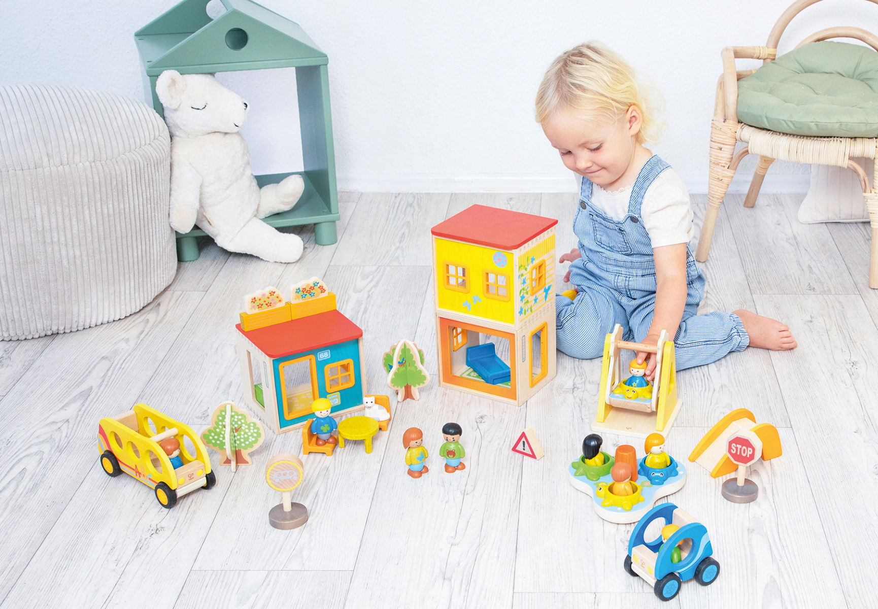 Dejligt, kæmpe legesæt til timevis af rolleleg. De tre huse kan stables som etager eller forskellige lejligheder, samles til et stort hus i stueplan eller blive til hver sin bolig til de små dukker. Eller måske er det ene af husene en skole eller en butik, som de skal hen til?Gyngen kan gynge frem og tilbageKarrusellen kan snurre rundt Indret med bord og stole og sengDukkerne kan dreje hovederne Lad dukkerne køre rundt i bus eller egen bil - og lær dem at stoppe ved stopskiltet. Masser af dele til timevis af intuitiv leg for et eller flere børn.Så robust at du formodentlig kan forære eller sælge sættet videre, når dit barn en dag er vokset fra det.