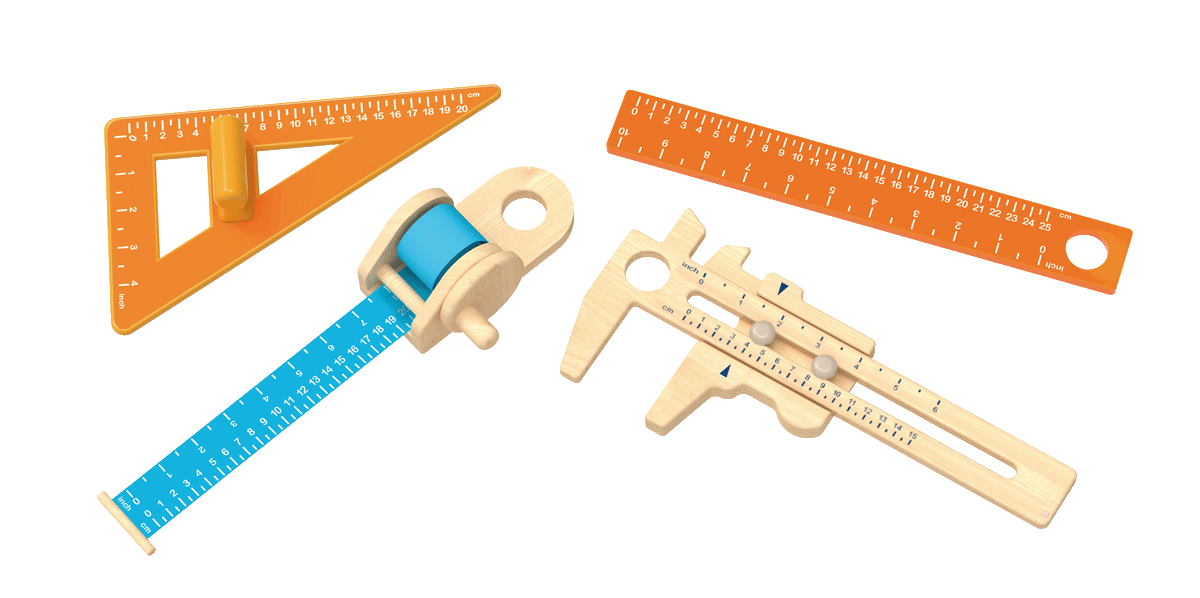 Her får dit barn både lineal, skydelære, målebånd og måletrekant, så alt fra den nærmeste frugt til din lillefinger og bamses livvidde kan blive målt op.Med både cm og tommer.