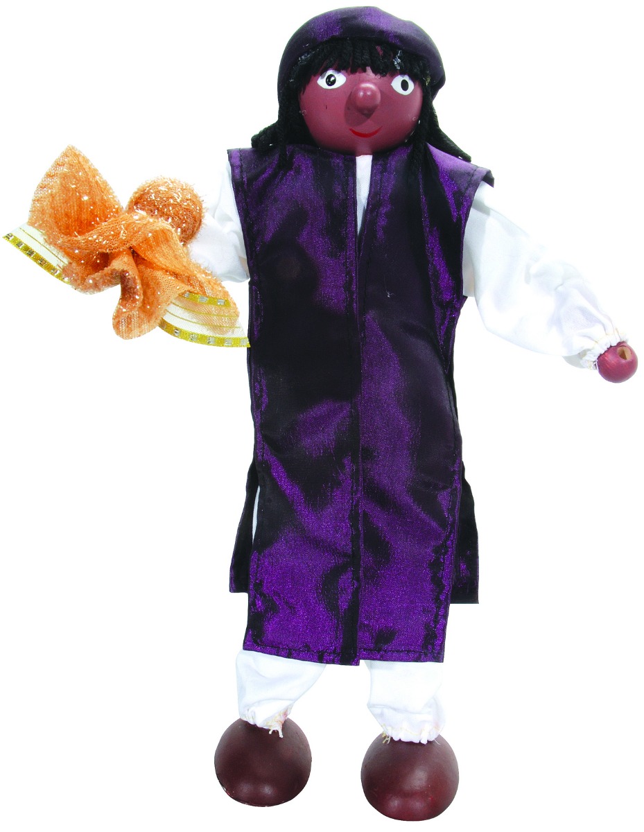 Stor bøjelig dukke med røde kinder, et nærværende udtryk i ansigtet og fin lille næse. Winzling dukker er af høj kvalitet og tåler leg i børnehaven eller mange genfortællinger af gode bibelhistorier for små og store.Dukken her er Melchior, en af de tre vise mænd, som var stjernetydere og kom fra Østerland, søgte efter den nyfødte konge af jøderne og havde gaver med til Jesus. Den fortælling bliver straks mere levende og spændende at høre med de fine bibelske dukker.Også i dag er vi fascineret af stjernerne, også i dag kommer vi med gaver, når nogen har fødselsdag.De tre vise mænd forærede jesusbarnet gaver, som var så mægtig fine, at man formoder, at de tre mænd var konger. De tre kaldes derfor også for Hellig tre Konger.Vidste du, at der i lande som Mexico, Spanien og USA er fester og optog til ære for de hellige tre konger?