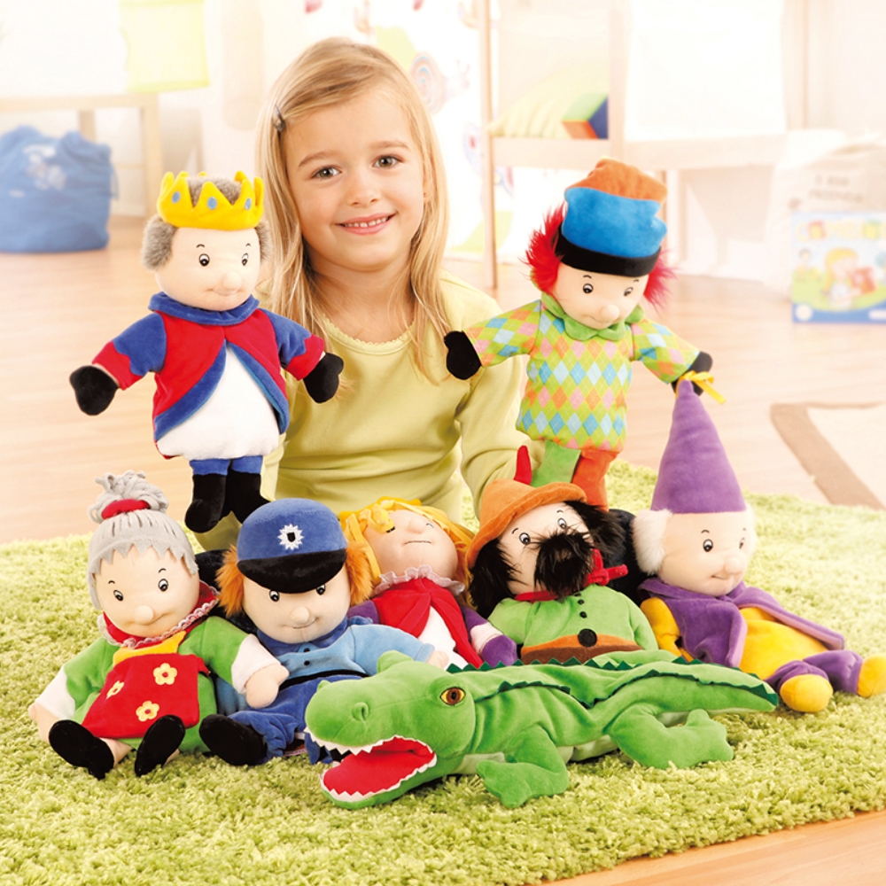 Disse hånddukker er perfekte til dukketeater. Sættet består af 8 forskellige karakterer:- Konge- Prinsesse- Bedstemor- Politimand- Bandit- Nar- Troldmand- KrokodilleRollespil med hånddukker stimulerer fantasien og udvikler sproget og selvtillid. Børn, der sommetider har svært ved at kommunikere har ikke noget problem, når de bruger en hånddukke.Hånddukken kan bruges af børne-/kvindehænder, men er ikke stor nok til en mandehånd.De farverige hånddukker er fremstillet af stof og har alle deres helt eget udtryk.Mål: 30 cm