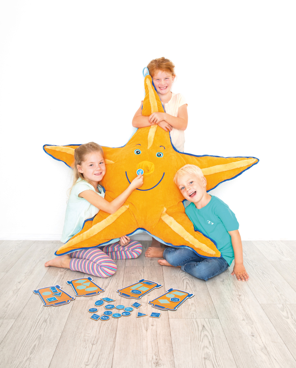Denne søstjerne er lidt af en basse på 2,3 kg og 130 cm. Så den er sulten og spiser lidt af hvert - også ting, flyder rundt i haven og ikke er godt for den. Hjælp den sultne bløde søstjerne med kun at have dejlige snacks i sin mave. Skraldet skal ud og man kan føle sig frem og mærke efter, om søstjernen mon er kommet til at sluge en sut eller en plastikklemme.Men hvor skal skraldet så hen bagefter? Selvfølgelig i skraldespandene, som er på de kort, I får med. Hver skraldespand har markerede omrids, som passer til skraldet i søstjernens mave, så der lægges op til sorteringsleg.Med en løkke til at hænge søstjernen op. Armene har wire i, så de kan bøjes.