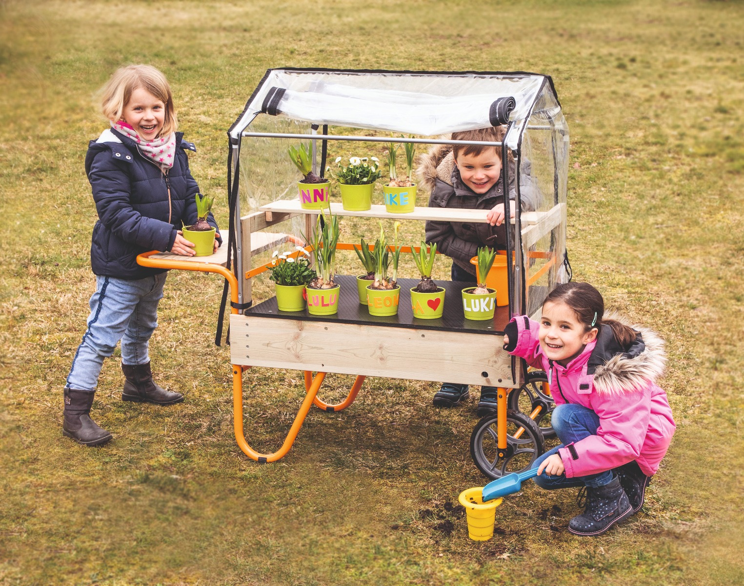 Lad børnene opleve naturen på helt tæt hold, når I sår, prikler, planter og måske endda høster i dette fine og robuste, mobile drivhus. Mål: 109x115x60 cm Plastoverdækning med lynlås for nem tilgang Hylde til afsætning og ekstra planter både inde i drivhuset og for enden Plads til op til 28 potter Ø13 cm