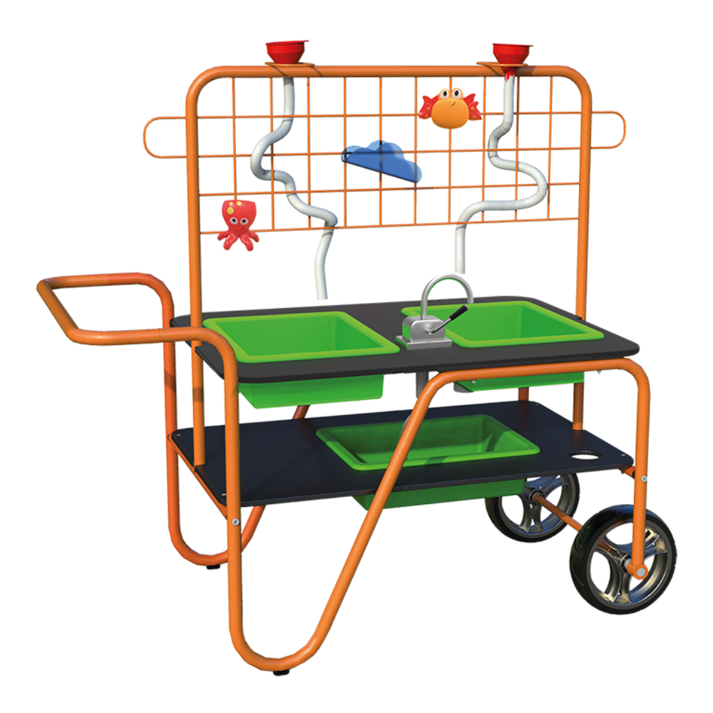Meget solidt og vejrbestandigt legebord til alle former for mudder-, sand- og vandleg i institutionen eller derhjemme. Det er bare godt kram, det her, og dine børn vil få et nyt yndlingssted at lege med fantasien og sanserne. Mål 106x100x57,5 cm Kan nemt køres rundt i hele haven eller på legepladsen Hæld vand i det nederste bassin og pump det op i det øverste bassin ved hjælp af håndpumpen, der virker ligesom en sæbedispenser, så der faktisk er rindende vand Bassin til jord, mudder, grus eller sand til venstre Der kan hænge alle mulige redskaber på gitteret Inkl gummislanger til vandleg, som monteres på gitteret sammen med tragterne. Vanddyr med forskellige funktioner giver nye dimensioner til legen Inkl: 2 gummislanger, 2 tragter, 3 blå klemmer til fastgørelse af legetøj og redskaber, 3 vanddyrs legetøj