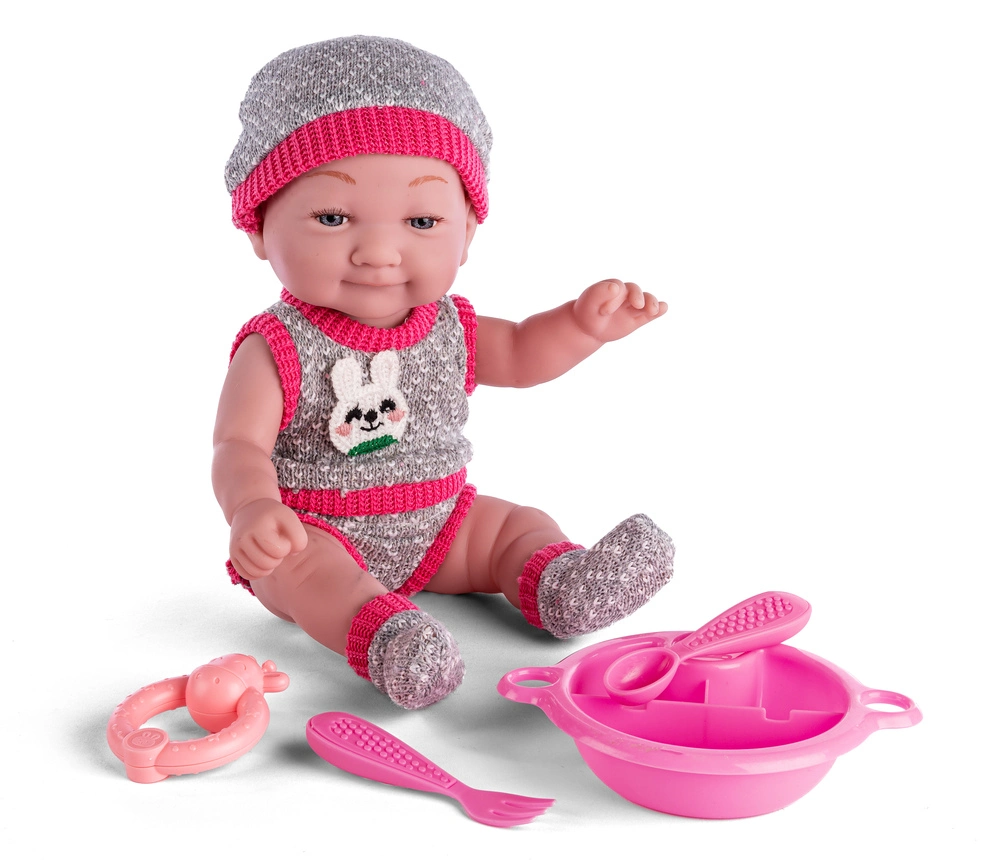 Mathilde dukke med ansigtsudtryk, strikket kjole og tilbehųr. 30 cm livagtig dukke med blųd krop og flot babytųj.