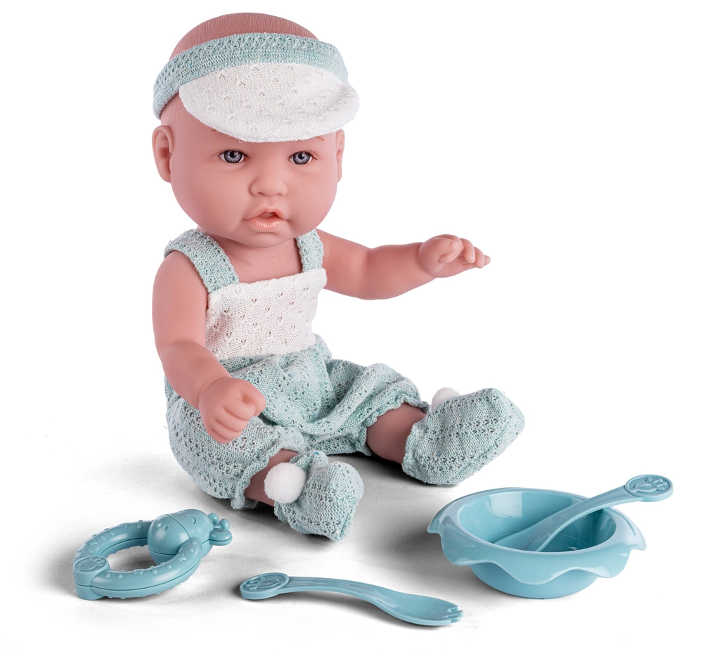 Mathilde dukke med ansigtsudtryk, strikket buksedragt og tilbehør. 30 cm livagtig dukke med blød krop og flot babytøj.