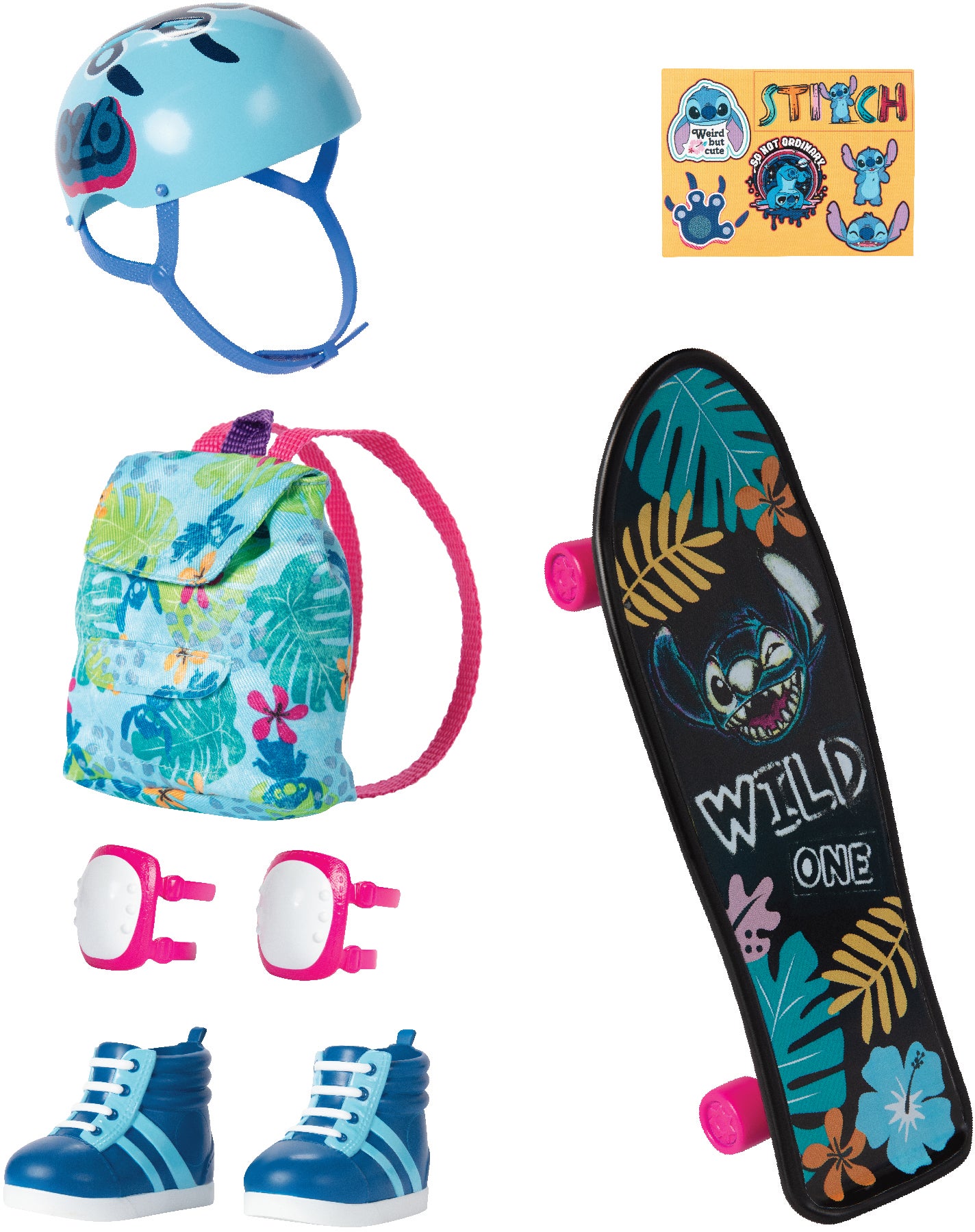 Tilbehørspakke fra Disney Lilo and Stitch med passende tilbehør til dukkerne. Perfekt til timevis af fantasifuld leg. - Indeholder: 1 skateboard, 1 hjelm, 2 sko, 2 knæbeskyttere, 1 taske, 1 klistermærkesæt. - Style din dukke! - Passer til de fleste dukker på 45 cm. - Underholder og stimulerer dit barn. - CE-mærket. - Dukke medfølger ikke. - Anbefalet alder: Fra 6 år. - Stof.
