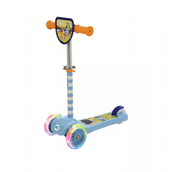 Tag med Bluey på en episk rejse med Mini Go! Scooter med Lys! Denne fantastiske trehjulede scooter er den perfekte ledsager for de mindste, der øver sig på koordination og balance. Kør med stil på de funklende, flerfarvede lysende hjul, der skinner selv i